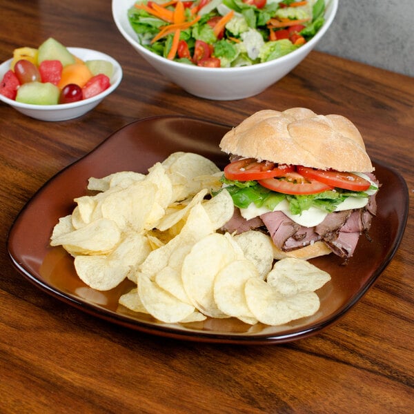 This plate may be used in combination with other size and color choices in the TuxTrendz Artisan line to create the perfect place setting at your restaurant, cafe, pub, or lounge. Durable and resistant to wear, this dish offers a creative backdrop to whatever foods you wish to serve. The rich, russet palette paired with the natural edge gives a hand-thrown appearance to enhance the rustic look. Whether needed at a diner, restaurant, or high-end bar, the Red Rock line is the perfect, eye-catching choice.