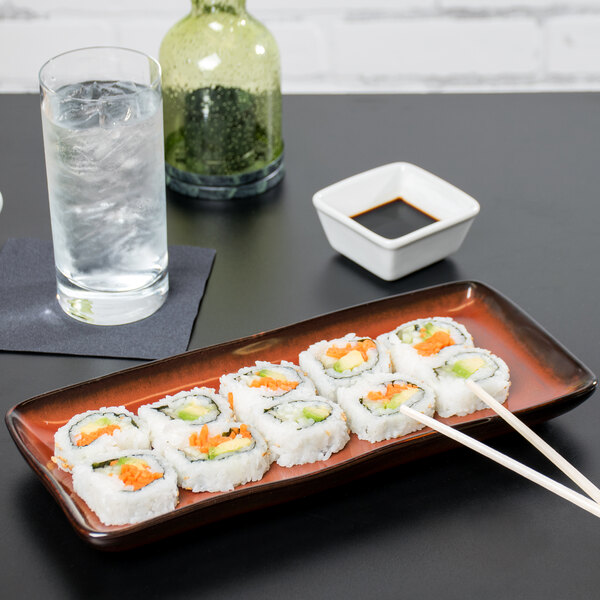 The 11 5/8" x 5 1/8" size of this tray makes it ideal for serving a variety of samples or appetizers. You can also use it to serve large meat or seafood entrees. Whether your specialty is farm to table fare or Asian cuisine, this vibrant color and pattern will enhance the presentation of your signature menu items.