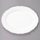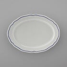 Create an elegant table setting with this Tuxton SBH-104 TuxTrendz Charleston white 10 1/2" x 7 3/4" scalloped edge china oval platter with blue band! Featuring a scalloped edge and white color with a blue band, this platter creates the perfect backdrop to showcase your signature culinary creations. Perfect for banquet halls, catered events, and restaurants, this platter is a versatile addition to your dinnerware collection. Great for plating lunch entrees, salads, and specialty seafood entrees, your signature dishes will look as great as they taste when served on this attractive, sophisticated dinnerware.