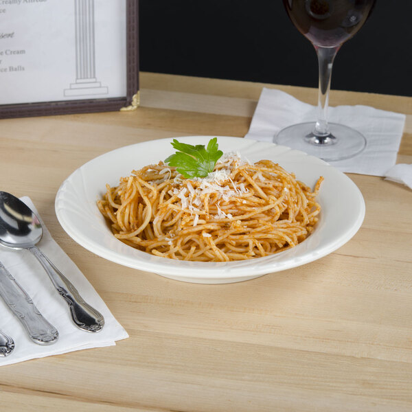 Create a durable and attractive table setting for your customers with this Tuxton YED-084 Monterey eggshell embossed rim china soup dish. It's a great piece to keep on hand and use while serving signature soups, salad, or pasta. The classic eggshell color frames your food attractively so you can create a tantalizing display showing off its fresh quality.