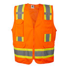 This vest is made of light weight polyester with a mesh back, and it features a sleeveless design so that your workers' range of motion is not affected. Conveniently sized for comfortable use, this vest fits over most clothing, and the easy-to-use zipper closure quickly closes to keep the vest neatly in place. It boasts a wide surface area in addition to its highly reflective design to draw attention to its wearer and maintain compliance with ANSI/ISEA 107-2015 Class II standards. In addition to safer working conditions, this vest also provides convenient utility with 8 outside pockets, 2 inside pockets, and dual mic tabs. This allows you to store items such as notepads, pens, radios, phones, and flashlights.