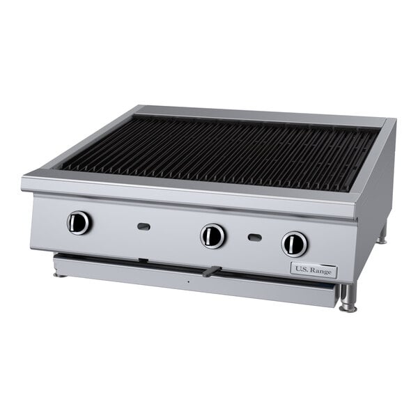 Perfect for the busiest snack bars or concession stands, the heavy-duty U.S. Range UTBG36-AB36 natural gas 36" ceramic briquette charbroiler with adjustable grates delivers the power and durability of a full-size charbroiler in a compact, countertop footprint! Featuring (3) 30,000 BTU cast iron burners, this unit is capable of quickly cooking up everything from burgers to chicken and even delicate seafood. Plus, thanks to the pre-formed ceramic briquettes, your food will give off a tantalizing smoky smell, making this charbroiler a great option for display cooking applications! One variable on/off valve controls each burner for simple operation.