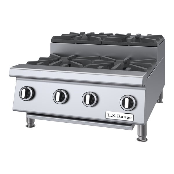 If you need a way to cook delicious menu items but don't have the floor space needed for a full-sized range, then look no further than this U.S. Range UTOG24-SU4 natural gas heavy-duty 4 burner step-up countertop 24" range. Designed for installation on top of a countertop or a refrigerated base or equipment stand, this unit features a sturdy stainless steel front, back, and side design able to withstand heavy use in your commercial kitchen. The 4 open burners, each with 30,000 BTU of heating power, offer a quick and reliable performance. Plus, the sturdy cast iron grates are simple to clean and strong for heavy use.