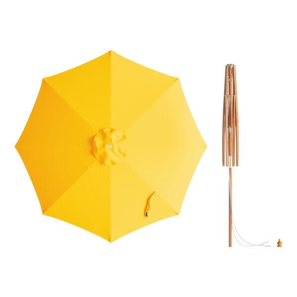 View All ItemsEnjoy the outdoors under the pleasant shade of this Lancaster Table & Seating 7 1/2' canary yellow pulley lift bamboo umbrella!
