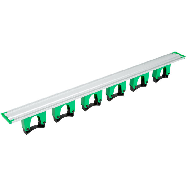 Keep your brooms, scrapers, squeegees, and other tools within easy reach with this tool holder! This 28" bar mounts on your wall and has six rubber grips that allow you to quickly snap tools in and out, and hold them securely when not in use. It's a great way to add additional storage options in a supply closet or storage area, and keep everything organized.
