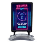 Grab the attention of passersby and direct them to your establishment with this United Visual Products double-sided aluminum sign! This sign features a silver-colored aluminum frame in a sleek, satin finish that snaps shut on all four sides. Its double-sided format securely displays a 24" x 36" sign on each side (sold separately) for effective advertisement from each direction. Posters can be changed out easily to keep your advertising fresh and relevant. Clear, non-glare sheets protect the poster, maintaining visibility in various lighting conditions.