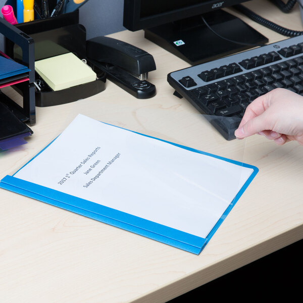 Looking for a way to neatly present your professional and academic reports? Look no further than this Universal Office UNV57121 11" x 8 1/2" light blue leatherette embossed paper report cover with clear cover and prong fasteners. The 3 prong fasteners hold up to 100 punched pages and provide a way to secure documents while making them easy to flip through. In addition, the transparent clear cover makes your report easily identifiable for professors, clients, coworkers, or bosses, while showcasing your title sheet.