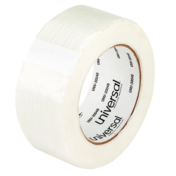 Use this Universal UNV30048 2" x 60 yards clear 110# utility grade filament tape to provide a heavy-duty seal to your packages! This tape is ideal for handling packages and bundling boxes while maintaining an impressive amount of strength. The clear construction lets the user easily see what they're doing for precise placement and efficiency.