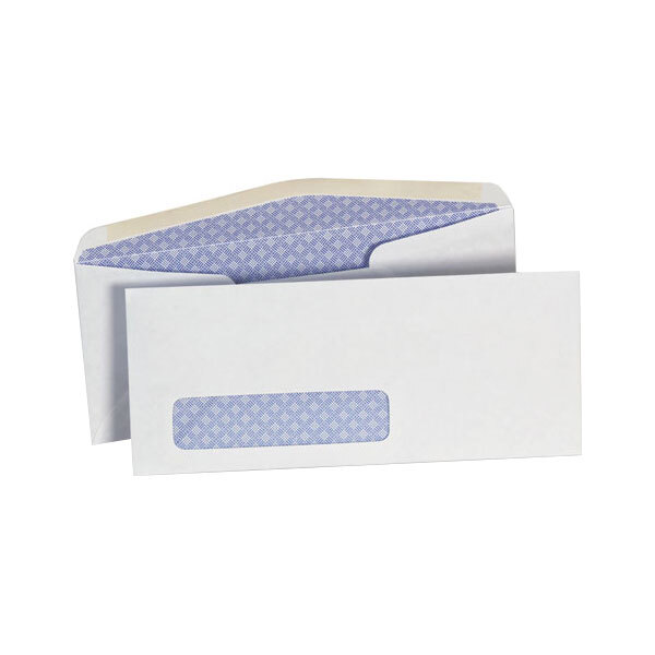 Great for sending business correspondences, invoices and bills, or personal memos, this Universal UNV35203 #10 4 1/8" x 9 1/2" white security envelope with window and fully gummed seal is the solution your office or business needs to keep on top of its day to day communications. Featuring a 24 lb. basis weight and white color with security tint, this envelope is both sturdy and professional looking to make sure it arrives to its destination in one piece while still looking presentable. The convenient fully gummed seal makes closing and securing the envelope quick and easy, while the viewing window allows names and addresses on articles inside of the envelope to be easily seen once sealed. Plus, the #10 size allows the envelope hold a #9 envelope for sending notices that require a response. No matter your exact mailing requirements, this #10 business envelope is sure to fit the need!