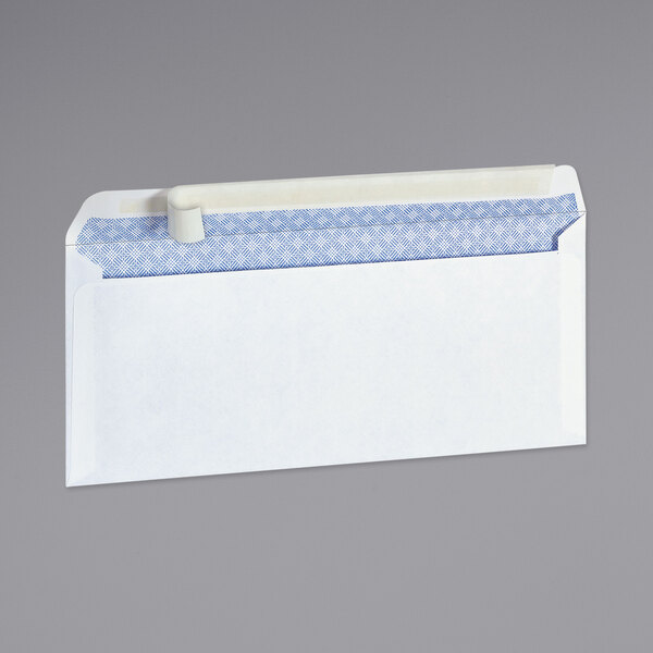 Great for sending business correspondences, invoices and bills, or personal memos, this Universal UNV36004 #10 4 1/8" x 9 1/2" white security envelope with peel and seal adhesive strip is the solution your office or business needs to keep on top of its day to day communications. Featuring a 24 lb. basis weight and white color with security tint, this envelope is both sturdy and professional looking to make sure it arrives to its destination in one piece while still looking presentable. The convenient peel and seal flap means you and your employees no longer need to moisten the envelope flap manually; just peel the adhesive strip cover and fold the flap down to seal the envelope's contents. Plus, the #10 size allows the envelope hold a #9 envelope for sending notices that require a response. No matter your exact mailing requirements, this #10 business envelope is sure to fit the need!
