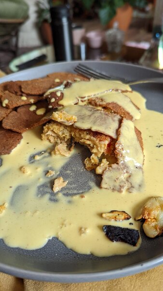 Good vegan option! Easy to overcook, or if you're using oil it will soak it up if you use too much (and your pan's not ready). I prefer to air fry the bacon strips at 425 degrees for 3 - 5 mins, depending on how much I cook. This bacon is great for burgers, breakfasts, and, my favorite a vegan benedict!