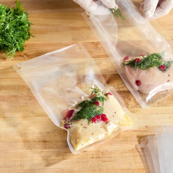 I recently purchased these chamber vacuum sealer bags for freezing many small portions of food. I really like that they have holes, as it is nice to be able to clip a bunch of the same product together or hang them in coolers/freezers. They appear to be very durable and will last a long time. I would highly recommend these if you need smaller bags for small portions.