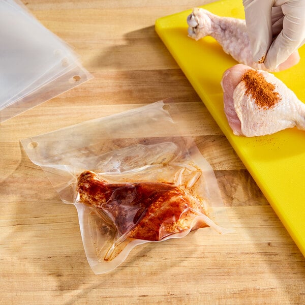 Preserve and extend your food's shelf life with these VacPak-It 6" x 8 1/2" 3 mil chamber vacuum packaging bags with holes. These industrial strength bags will help keep your food fresh up to five times longer than traditional storage methods, making it an extremely cost-effective alternative as well! It securely seals any solid or liquid product with any chamber vacuum packaging machine to ensure long lasting freshness and feature a 6" open end for sealing.
