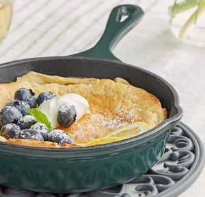 Whether you are preparing mouthwatering appetizers or flavor filled desserts, this mini serving dish is the perfect addition for any restaurant. Not only was this mini skillet designed with functionality in mind, but the dish's trendy, deep green color is sure to grab the attention of your patrons for an eye-catching display, making it perfect for oven-to-table use, buffets, or open kitchens. Pair it with other bistro green Valor cookware (sold separately) for a complete, professional look.