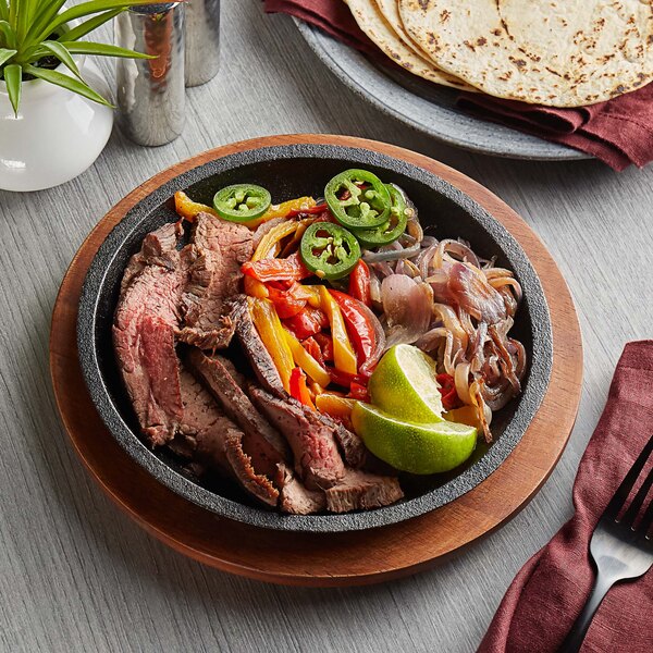This premium sizzler is designed to expertly serve your signature fajitas hot, sizzling, and fresh from the kitchen! Its sturdy construction is ideal for oven-to-table applications, and thanks to its undeniable durability, it's sure to offer long-lasting use in your commercial kitchen. Use it to bring piping hot chicken, fish, steak, and vegetables out to the table.