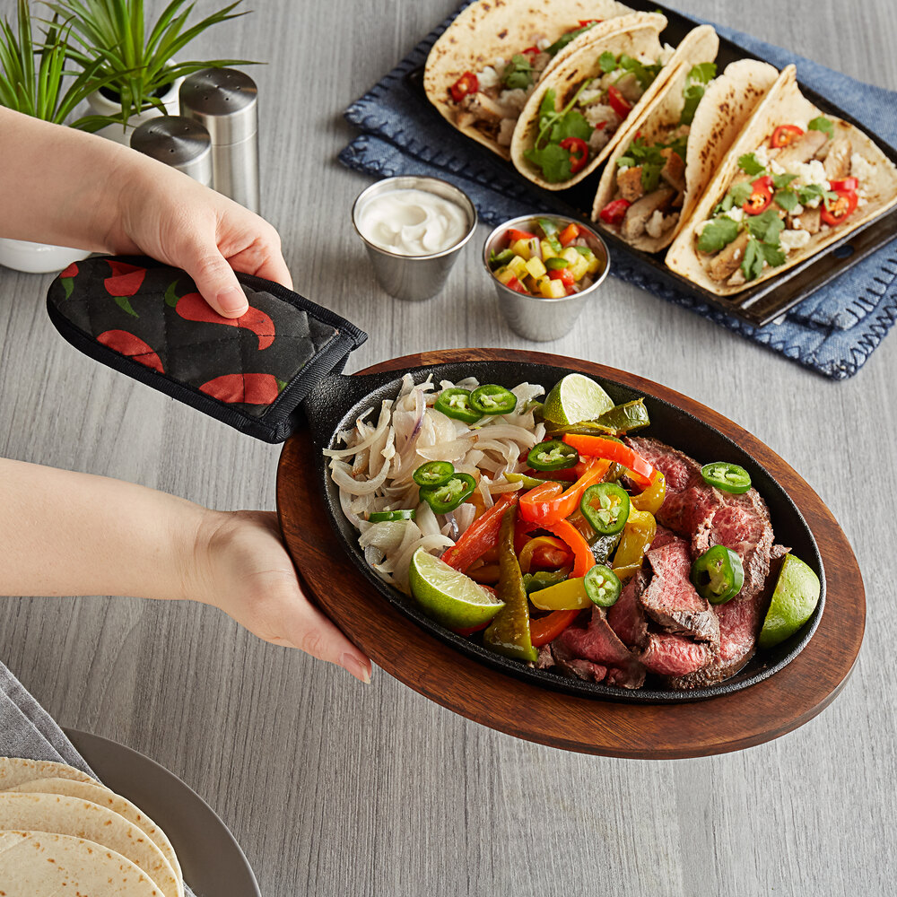 There's nothing quite like the smell and visual appeal of a fajita platter coming straight out of the kitchen and being delivered right to your table, still hot and sizzling. This Valor pre-seasoned cast iron fajita skillet with chestnut finish rubberwood underliner set creates a one-of-a-kind presentation that's sure to keep your customers coming back for more, without breaking your budget!