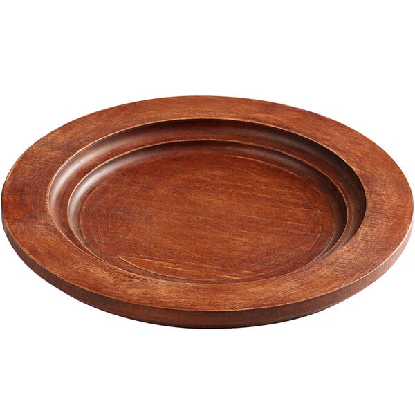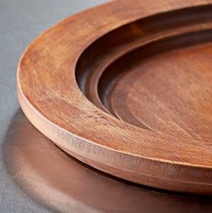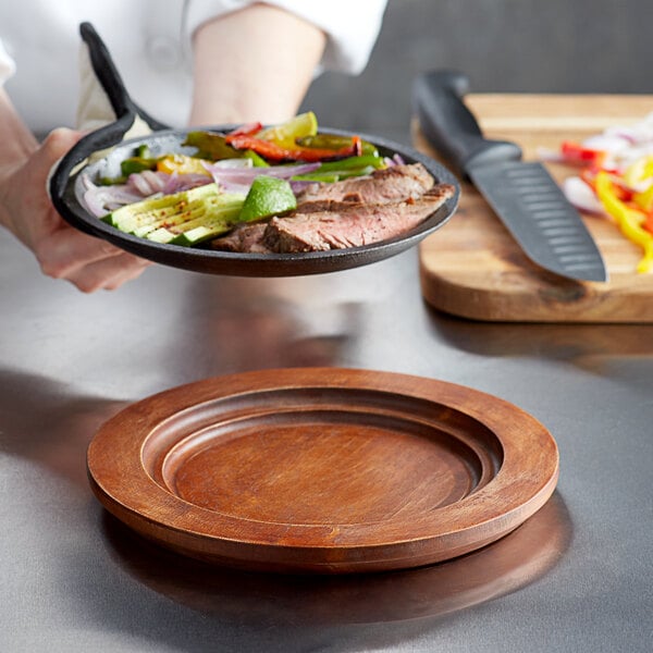 There's nothing quite like the smell and visual appeal of a skillet coming straight out of the kitchen and being delivered right to your table, still hot and sizzling. This round rubberwood underliner makes serving oven-to-table dishes easy and safe by providing a barrier between the hot skillet and the tabletop. It also creates a one-of-a-kind presentation that's sure to keep your customers coming back for more!