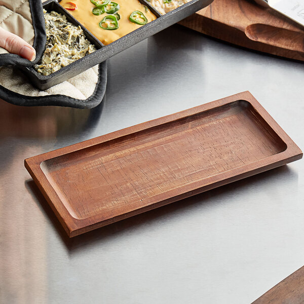 There's nothing quite like the smell and visual appeal of a skillet coming straight out of the kitchen and being delivered right to your table, still hot and sizzling. This rectangular rubberwood underliner makes serving oven-to-table dishes easy and safe by providing a barrier between the hot skillet and the tabletop. It also creates a one-of-a-kind presentation that's sure to keep your customers coming back for more!