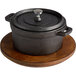 Valor 8 oz. Pre-Seasoned Mini Cast Iron Pot with Rustic Chestnut Finish Rubberwood Underliner