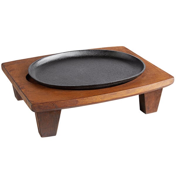 Create and serve sizzling entrees and appetizers with this Valor 13" x 10" oval cast iron skillet with chestnut finish display stand!