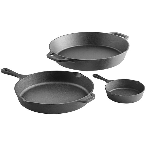 Perfect for both cooking and serving, this set of Valor cast iron skillets is a great way to introduce the trendy look of cast iron into your business. Extremely long-lasting, cast iron is known for its even cooking and excellent heat retention. This particular set from Valor includes 3 pieces, including an 8" skillet, a 15" skillet, and a 17" skillet.