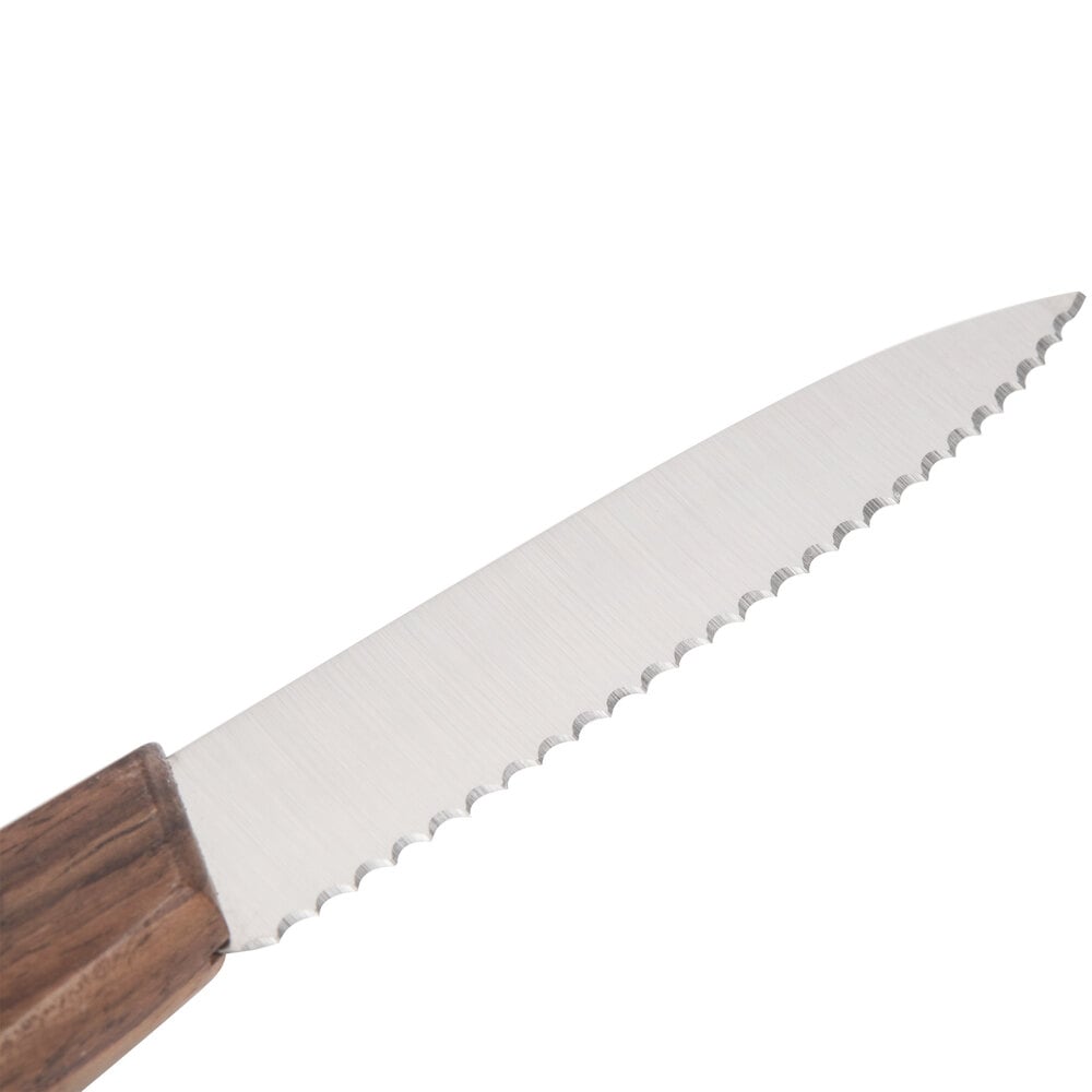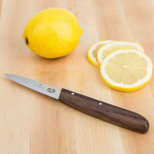 Easily prep fruits and vegetables with this Victorinox 47000 3 1/4" spear point serrated edge paring knife with a small wood handle.