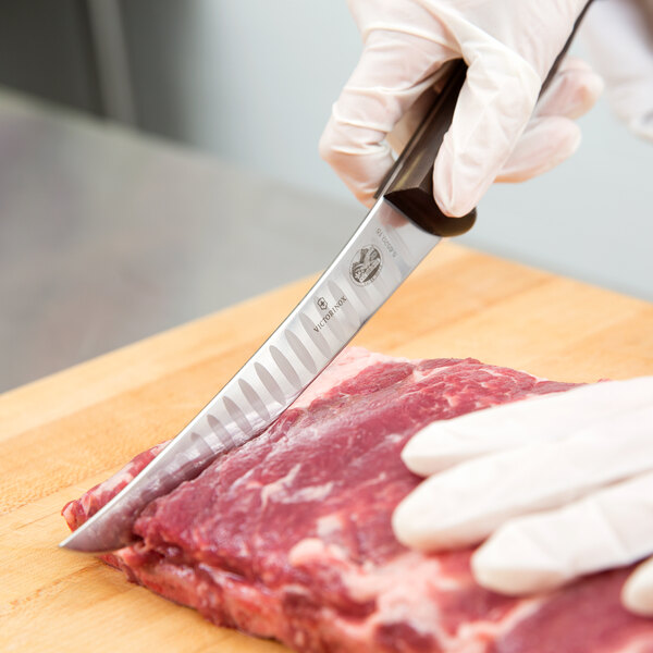 Provide incredibly lean, properly portioned cuts of red meat, fish, and poultry with this Victorinox 40212 6" granton edge extra wide stiff curved boning knife with wood handle.