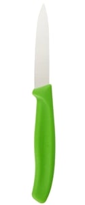 I love the color choices of this paring knife by Victorinox. The colors are bright and make it hard for the knife to be misplaced. This orange handled knife is my favorite. The blade comes sharp right out of the package and can be used all the time without having to be sharpened.