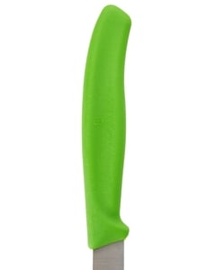 This knife features a green handle, perfect for color-coding kitchen tasks and maintaining a sanitary work environment. It also features an ergonomic, slip-resistant grip for a comfortable hold.