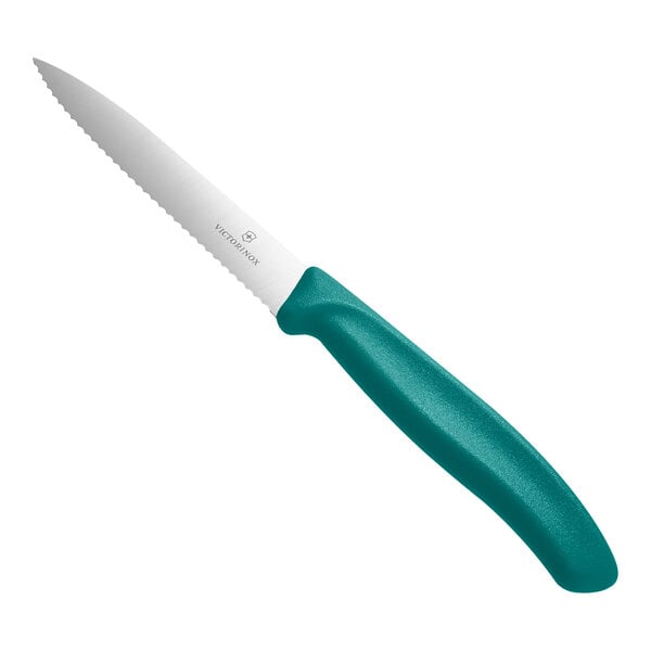 Built to bring long-lasting quality to your kitchen, this Victorinox 6.7734.C1 Swiss Classic 4" serrated spear point paring knife with kale green handle is the ideal choice for you. The sleek lines of this knife make it easy to wield and comfortable to hold while peeling, mincing, paring, or cutting a variety of fruits and vegetables. The serrated edge cuts through foods with ease, and the spear point tip is perfect for small, precise tasks. The stainless steel blade is also made to hold a sharp edge up to 60% longer than typical knives, while remaining easy to re-sharpen.