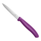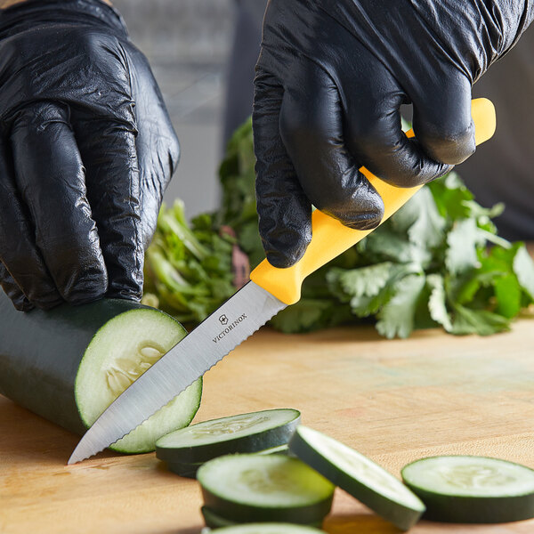 Built to bring long-lasting quality to your kitchen, this Victorinox 6.7738.C1 Swiss Classic 4" serrated spear point paring knife with lemon yellow handle is the ideal choice for you. The sleek lines of this knife make it easy to wield and comfortable to hold while peeling, mincing, paring, or cutting a variety of fruits and vegetables. The serrated edge cuts through foods with ease, and the spear point tip is perfect for small, precise tasks. The stainless steel blade is also made to hold a sharp edge up to 60% longer than typical knives, while remaining easy to re-sharpen.