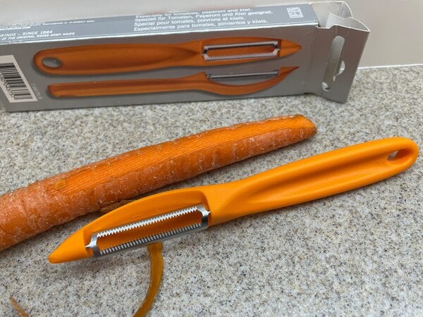 Designed by the same company that created the Swiss Army knife, this kitchen essential offers incomparable peeling power. Featuring an ultra-sharp, high carbon serrated stainless steel blade with satin finish, this tool takes on peeling tasks with confidence. Thin tomato and kiwi skins are no match for this Victorinox universal peeler, removing them with ease. Designed with your kitchen's organization in mind, the handle features a built-in hole to make drying and storage easy. Best of all, this peeler's bright red color adds a fun pop of color to every food prep application and can be incorporated into a color-coded system for organization that's not only easy but also fun.