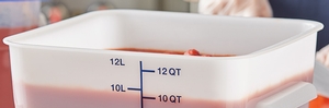 This container also features bright, bold colored graduations in quarts and liters to make measuring easier when portioning out ingredients or prepared food. Easily identify and track the date your food product was made using the reusable "date" indicator at the bottom of the container or simply adhere a label to the side of your container. When paired with a compatible lid (sold separately), it keeps food fresher, longer, than when covered with traditional foil or plastic wrap.