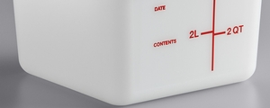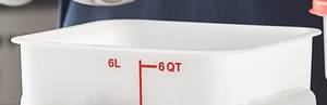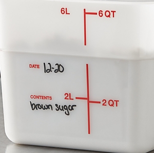 This container also features bright, bold colored graduations in quarts and liters to make measuring easier when portioning out ingredients or prepared food. Easily identify and track the date your food product was made using the reusable "date" indicator at the bottom of the container or simply adhere a label to the side of your container. When paired with a compatible lid (sold separately), it keeps food fresher, longer, than when covered with traditional foil or plastic wrap.