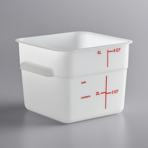 We use these 8qt containers for everything and they're super durable! Took years for one of them to crack from just general wear and tear. They perfectly hold one batch of cookie dough for us and they stack easily with the lids. The red lids fit both the 6 and 8qt size so you can get both sizes at once and use the same lid. Definitely recommend using these in your restaurant or coffee shop. They make storing things a breeze.