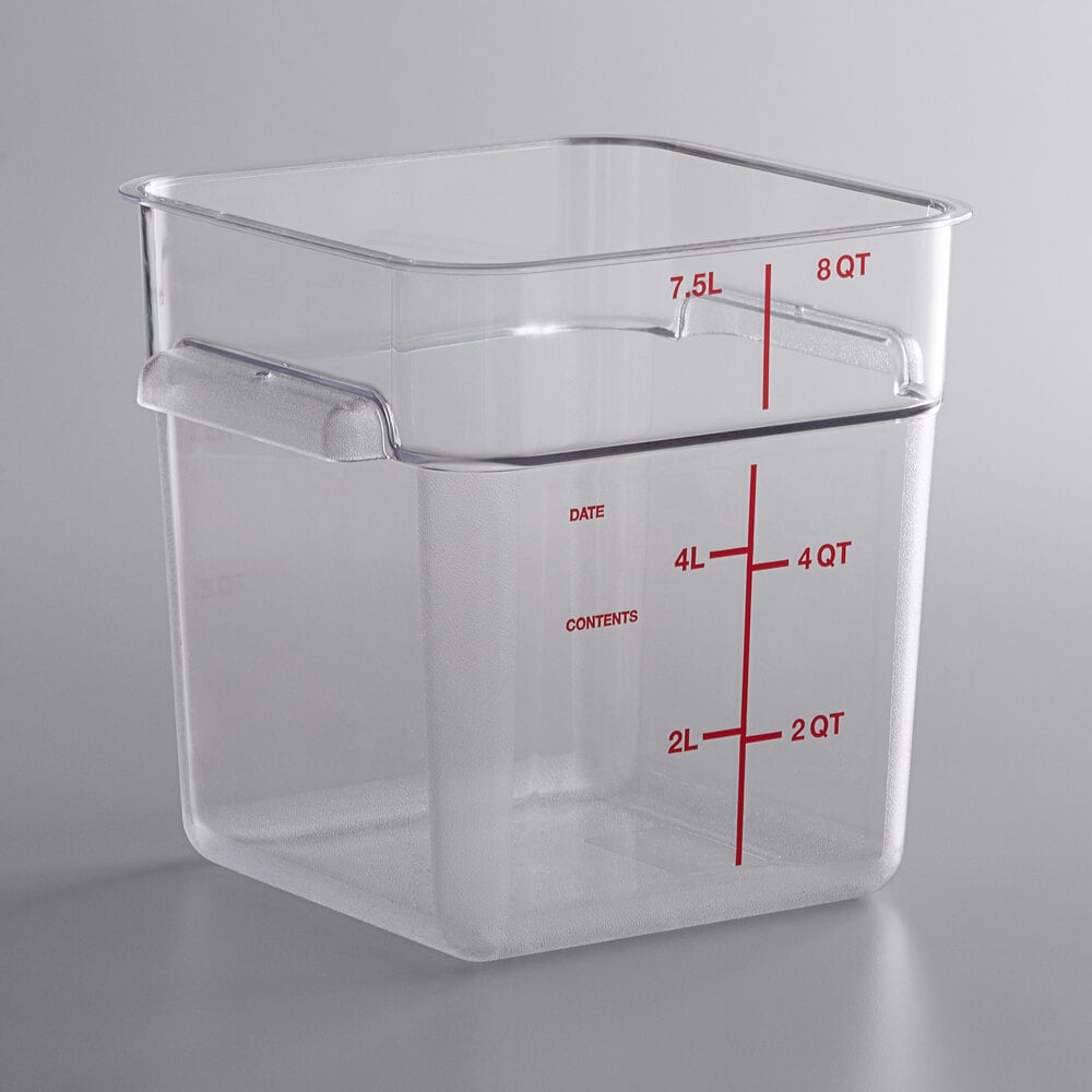 With a completely clear construction and large capacity, the virtually-unbreakable polycarbonate container's design guarantees the longevity you need in your commercial kitchen. This food storage container's square shape means it maximizes storage space with no wasted space around the container, up to 25% better use of space than standard round food storage containers.