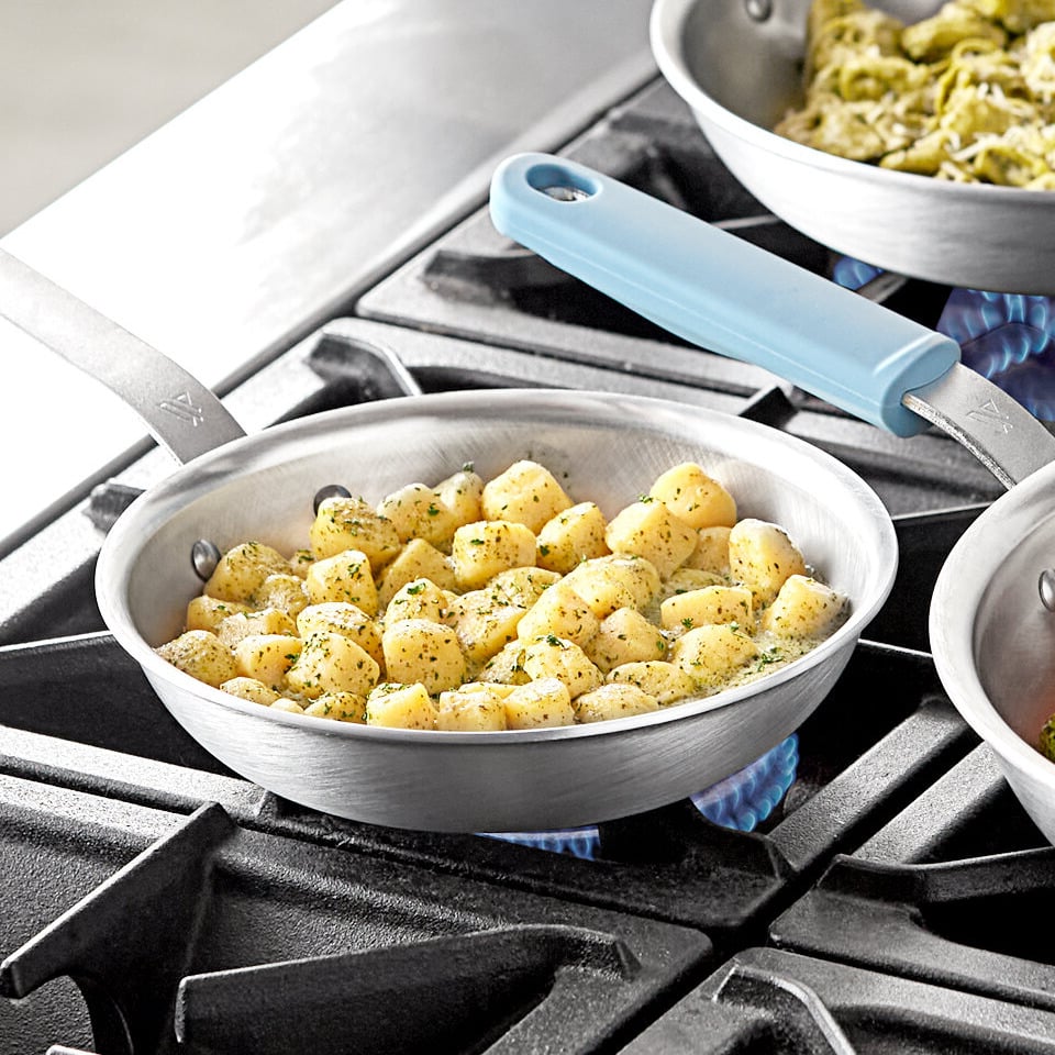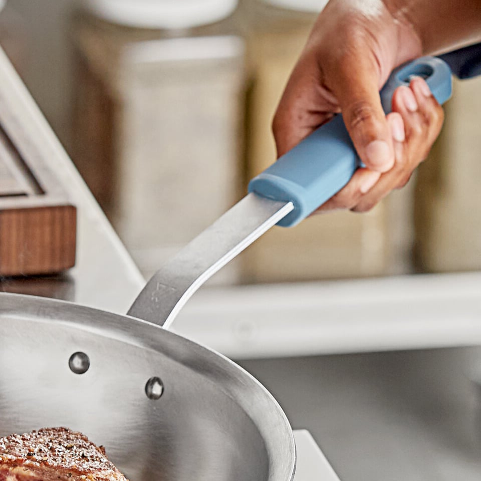 The ergonomic, plated handle design offers comfort and reduces heat transfer, ensuring a safe and secure grip during use. It has a hanging hole that allows for easy hanging storage in your busy kitchen. Additionally, it fits right into the pan's oven-safe silicone grip that can stand up to 450 degrees Fahrenheit of continuous use and up to 600 degrees Fahrenheit of sporadic use.