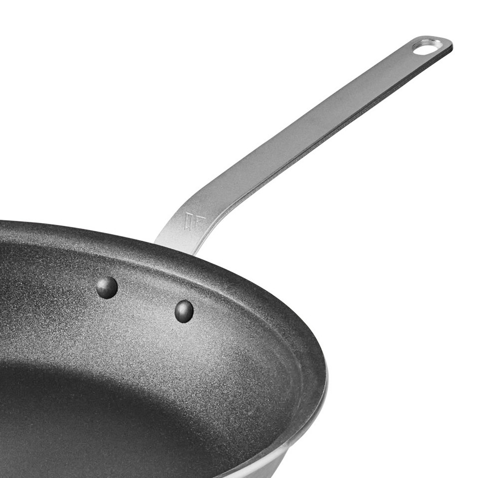 The ergonomic, plated handle design offers comfort and has a hanging hole that allows for easy hanging storage in your busy kitchen. The pan's aluminum material provides rapid and even heat distribution, eliminating hot spots and delivering consistent cooking results every time. The curved side walls prevent excess steam when in use, making it a versatile and efficient tool for a variety of cooking applications.
