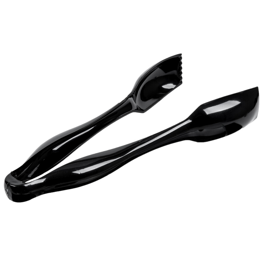 These Visions 10 1/2" black disposable plastic tongs eliminate the hassle of washing, transporting, and replacing expensive silverware. Providing a simple yet attractive design, these tongs combine appearance and functionality into one great product. Pick up everything from pastries, bagels, and other desserts to fresh fruit, vegetables, and salads!