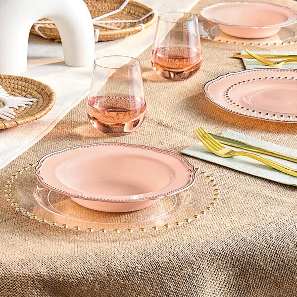 Effortlessly elevate the style of your next event by mixing and matching this versatile option with other Visions Heirloom disposable dinnerware (sold separately). The disposable design ensures efficient cleanup, making this plate ideal for high-volume events where fast turnaround is essential. Take the hassle out of catering with this elegant and versatile blush plastic plate and create a fresh, new look for every event!