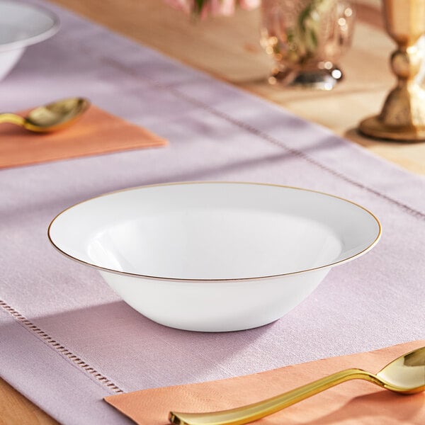 Add a touch of sophistication to your catered event with the Visions Coupe Dynasty 10 oz. white round plastic coupe bowl with a gold band.