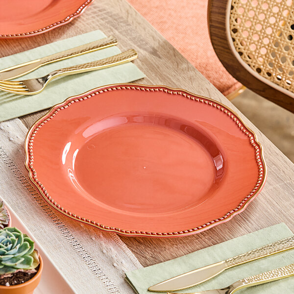 Visions Heirloom 10" Terra Cotta Round Plastic Plate with Gold Vintage Rim - 120/Case