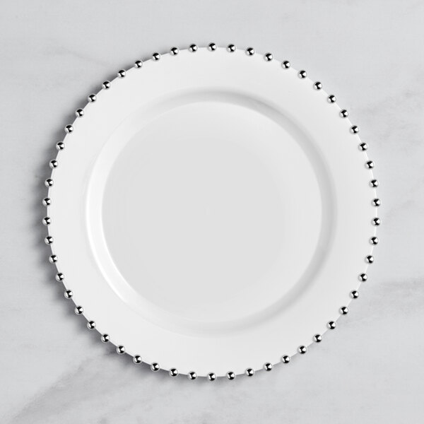 Visions Beaded 10" White Round Plastic Plate with Silver Beaded Rim - 12/Sample