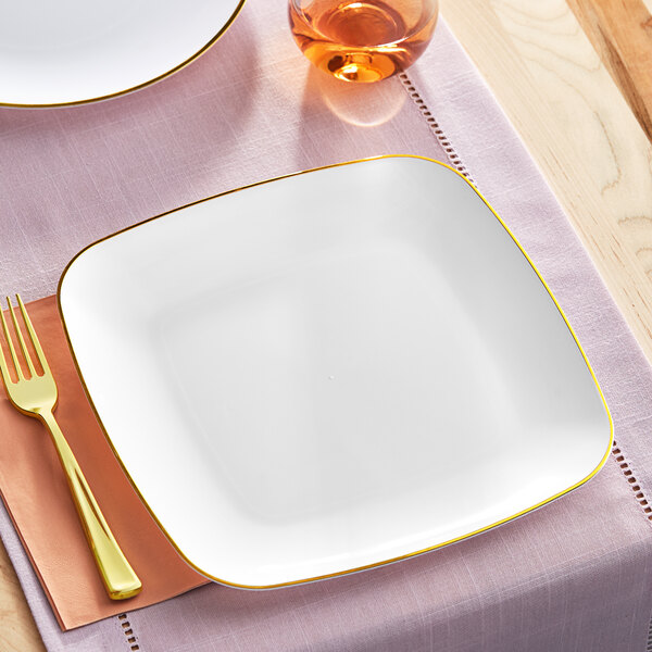 Add a touch of sophistication to your catered event with the Visions Coupe Dynasty 10" white square plastic coupe plate with a gold band.