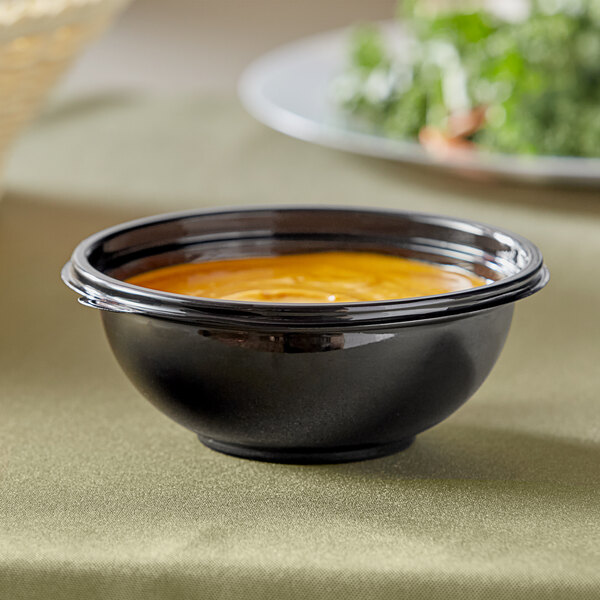 This bowl is made with sturdy PET construction. The black coating provides an upscale look and is sure to blend into nearly any occasion.
