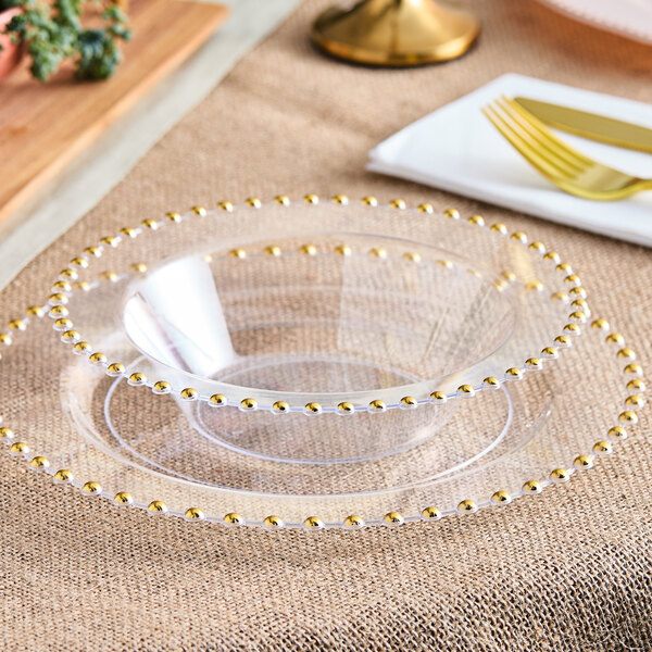Visions Beaded 14 oz. Clear Round Plastic Bowl with Gold Beaded Rim - 12/Sample
