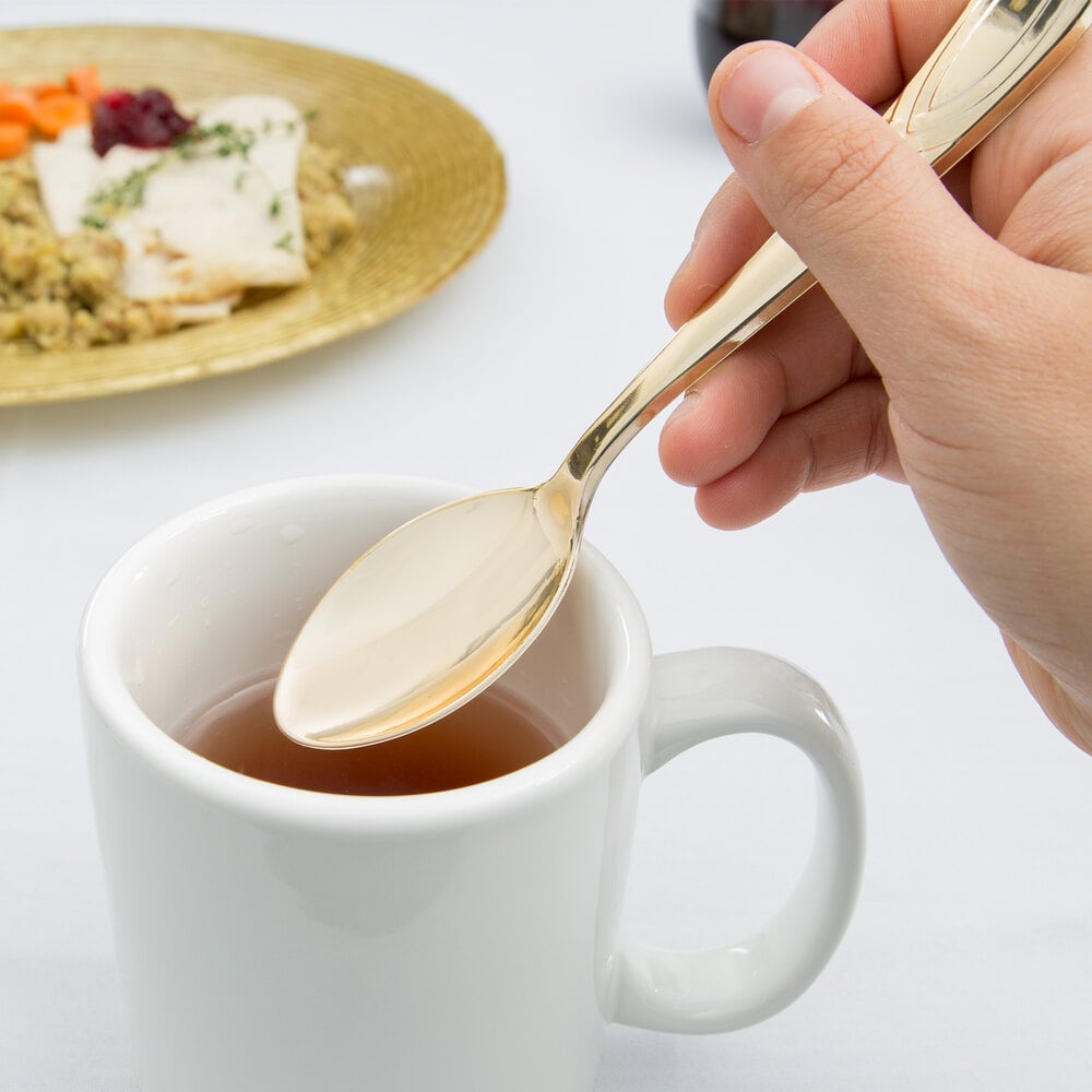 Featuring the look of a gold-plated spoon at a fraction of the cost, this Visions Skyline spoon is the ideal flatware for a variety of applications. Because this flatware is disposable, you won't have to waste any extra time washing large quantities of dishes. Easily add this spoon to the place settings at your banquet, party, or other catered event!