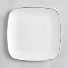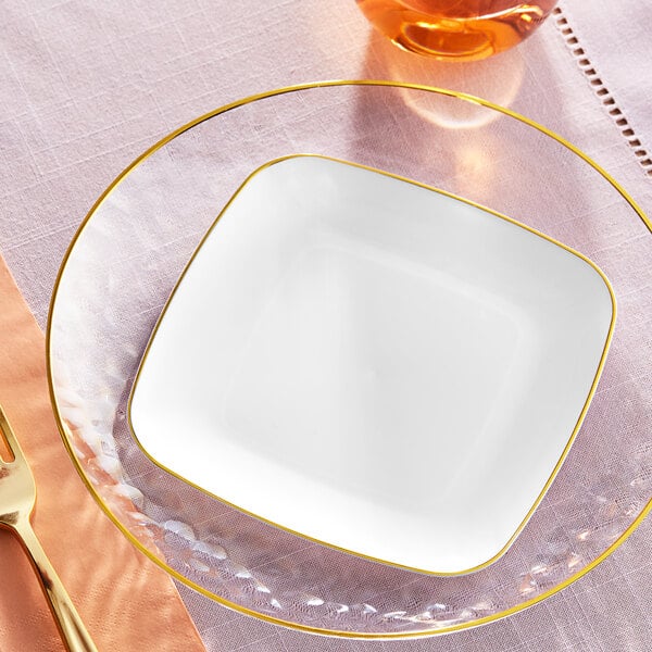 Add a touch of sophistication to your catered event with the Visions Coupe Dynasty 6" white square plastic coupe plate with a gold band.