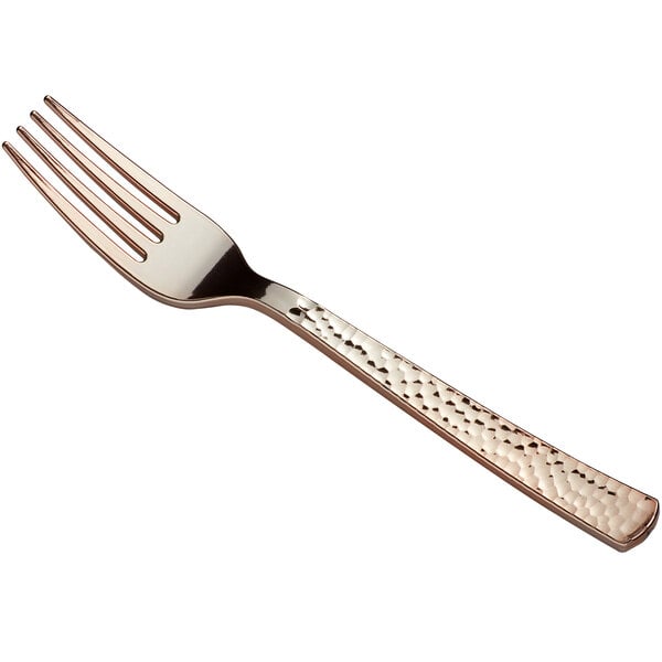 The elegant, glossy rose gold finish and unique hammered finish also give this plastic fork the appearance of regular silverware. With this Gold Visions extra heavy weight plastic fork, you can provide the perfect elegant dining environment at weddings, parties, and catered events, without the upscale flatware price.