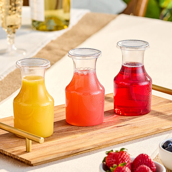 Crafted from durable PET plastic, this carafe offers a large 7.5 oz. capacity, making it perfect for serving a variety of beverages like juice and wine, as well as sauces and salad dressings. Its crystal-clear clarity provides optimal product visibility, allowing your guests to see the vibrant colors of the drinks inside and you to assess refilling needs throughout a cocktail party or special catering event.